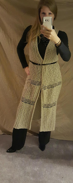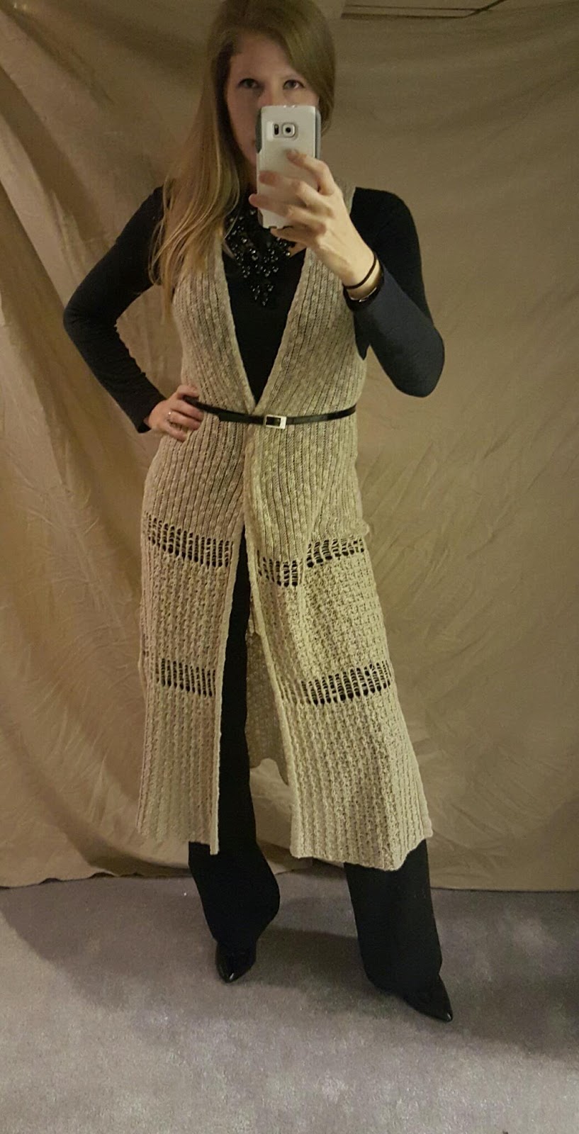 This duster speaks for itself. It looks really cute with leggings, but I wore it to work today, so wore dress pants instead. I wore patent shoes and a matching belt and decided to wear this new bib necklace. To match the beading on the necklace, I wore flower shaped bead earrings.