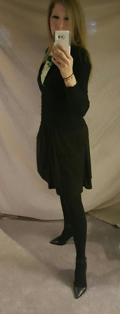 This necklace was a birthday special that I added to my Amazon wish list. When it came time to match it up with current items in my closet, I pulled out my 3/4 kelly green tee, which I sometimes wear underneath this 3/4 sleeve lace shirt. It particularly works well because the flowers in the necklace go with the flowers on the lace. Then, I realized how perfect it was that I had green rose earrings-- they matched perfectly with the necklace! While not ideal, I wore all black with this outfit, but I did like the pocketed skirt and heels. Lastly, I wore green and blue eye shadows.