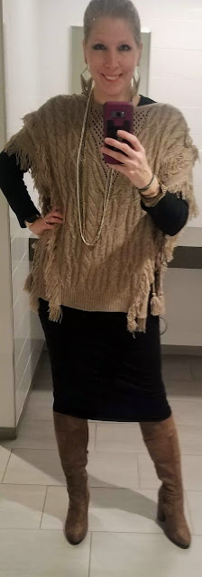 I guess I've been in the mood to wear beige- I think it was the new boots I hadn't worn yet as well as the new top I got for Christmas and (another) top I was given. So, I decided to pull the three outfits together, below, since they are all very similar. One shirt worn twice- both inside and outside of work, all jewelry and makeup is the same with all three outfits. The only difference is which bottoms and shoes I wore. You could actually just interchange my hairdo and sweater with the two work outfits.